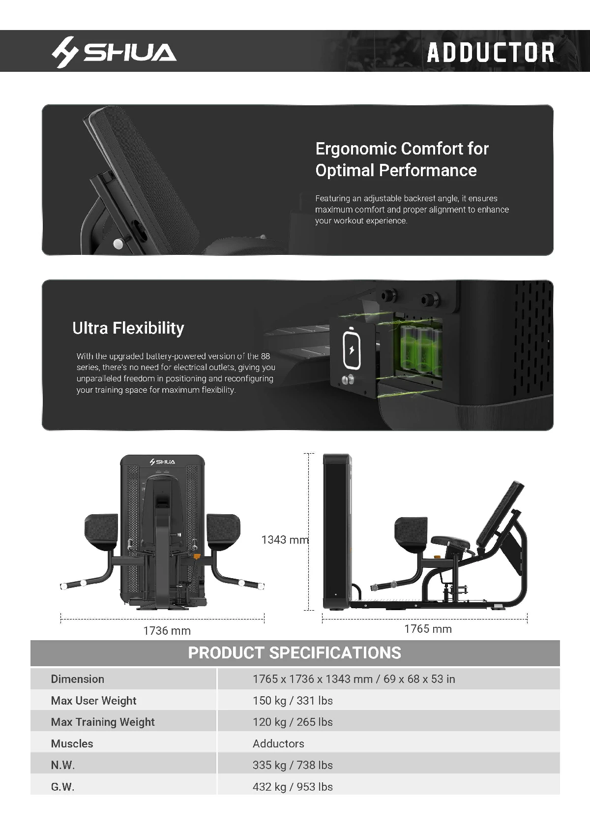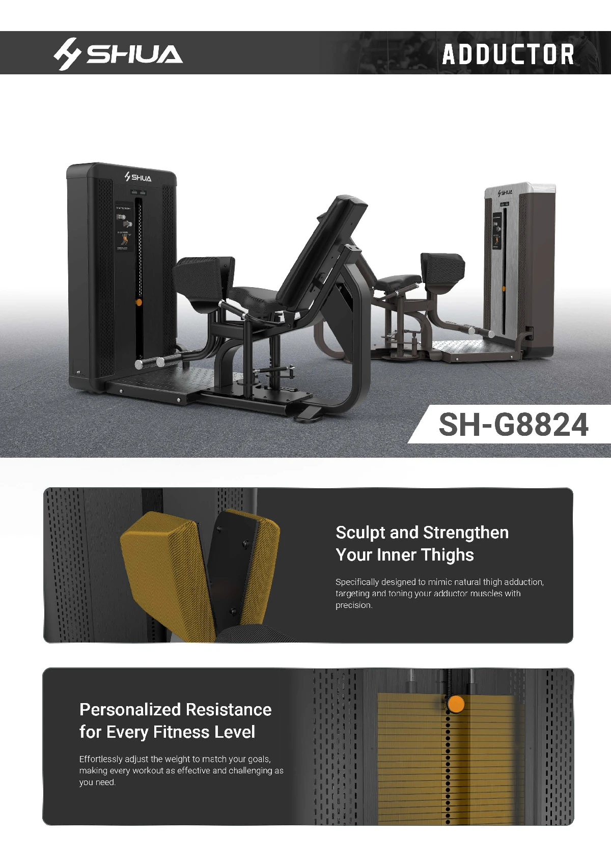 The SH-G8824 Adductor is engineered with ergonomics at its core, ensuring each workout aligns with the body\\\'s natural movement for maximum comfort. It efficiently targets the inner thigh muscles, delivering a seamless and effective training experience that supports natural lower body motion.